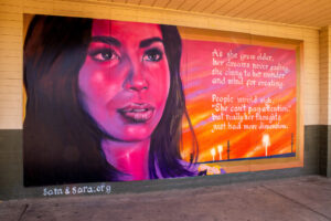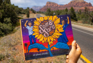 Isaac began painting his magnum opus during the pandemic. He lived and worked with diverse societies, from Bisbee to Winslow, Chloride to Ajo, and 22 other communities! The artist coordinated this project by contacting each area’s chamber of commerce, offering to donate Sam&Sara murals to smaller towns with no art budget. APS also participated, commissioning him to paint 14 power substations.