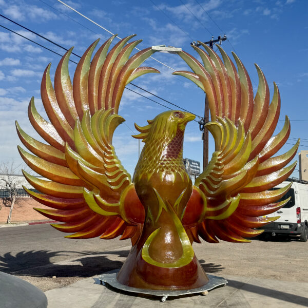 “This large, rising Phoenix sculpture is internally lit to serve as a beacon in the night. It signifies a nexus to South Phoenix, where much of this city originates. The fiber-reinforced plastic body is light and translucent but allows for a charge of color both day and night.